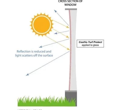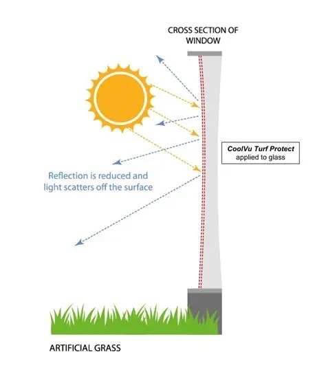 CoolVu Artificial Grass Protection films are professional-grade exterior window treatments specifically engineered to stop the "magnifying glass" effect caused by high-efficiency (Low-E) windows.