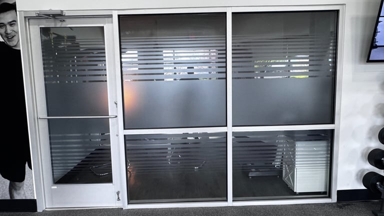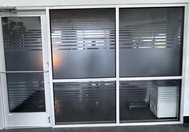 Obscures digital screens from outside view while keeping the rest of the glass clear.